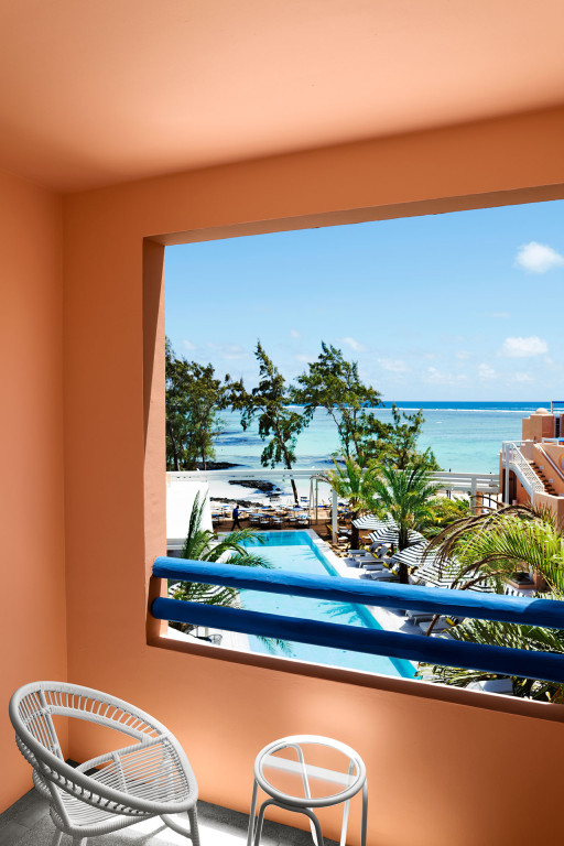 개인 발코니에서 수영장, 해변, 바다를 바라볼 수 있습니다. |