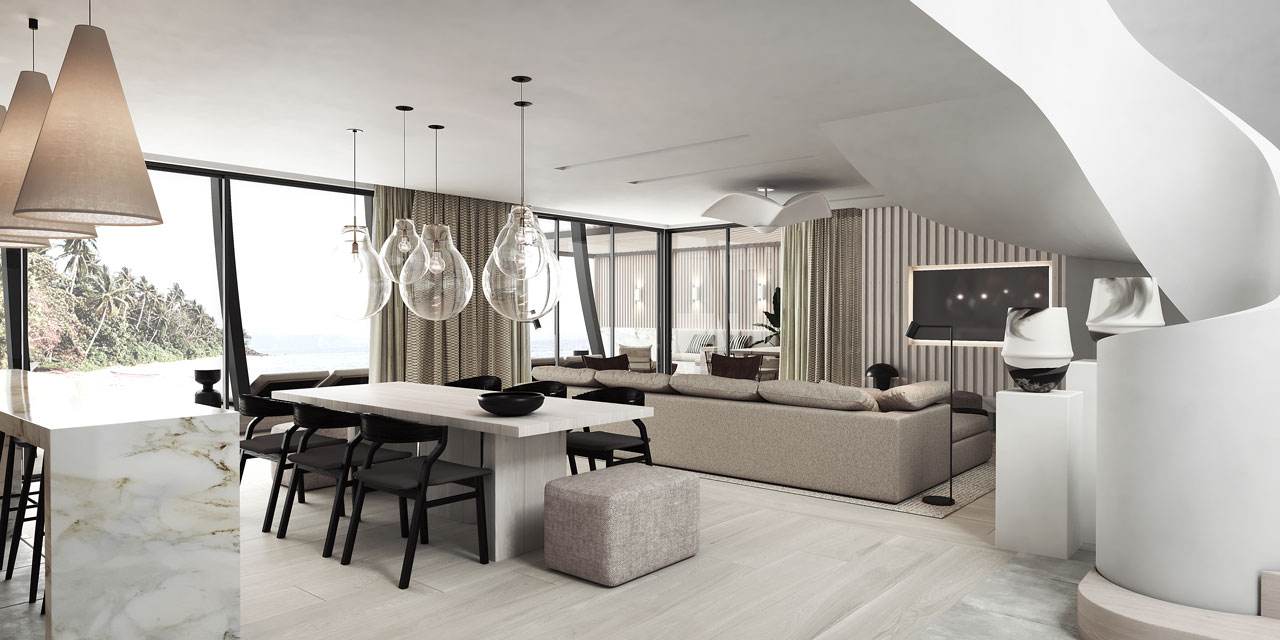 각 스위트룸, 빌라, 레지던스 및 펜트하우스는 유명한 영국 디자이너 Kelly Hoppen과 JFA Architects 회사의 작품입니다. |