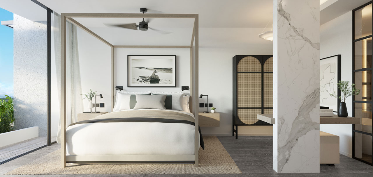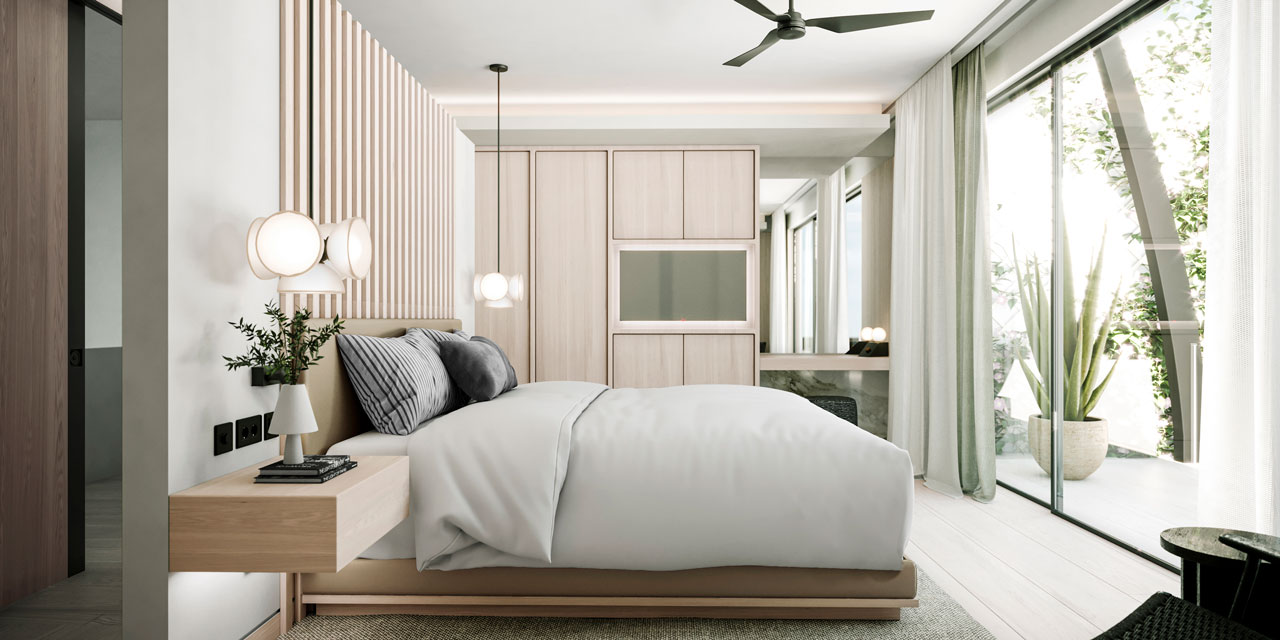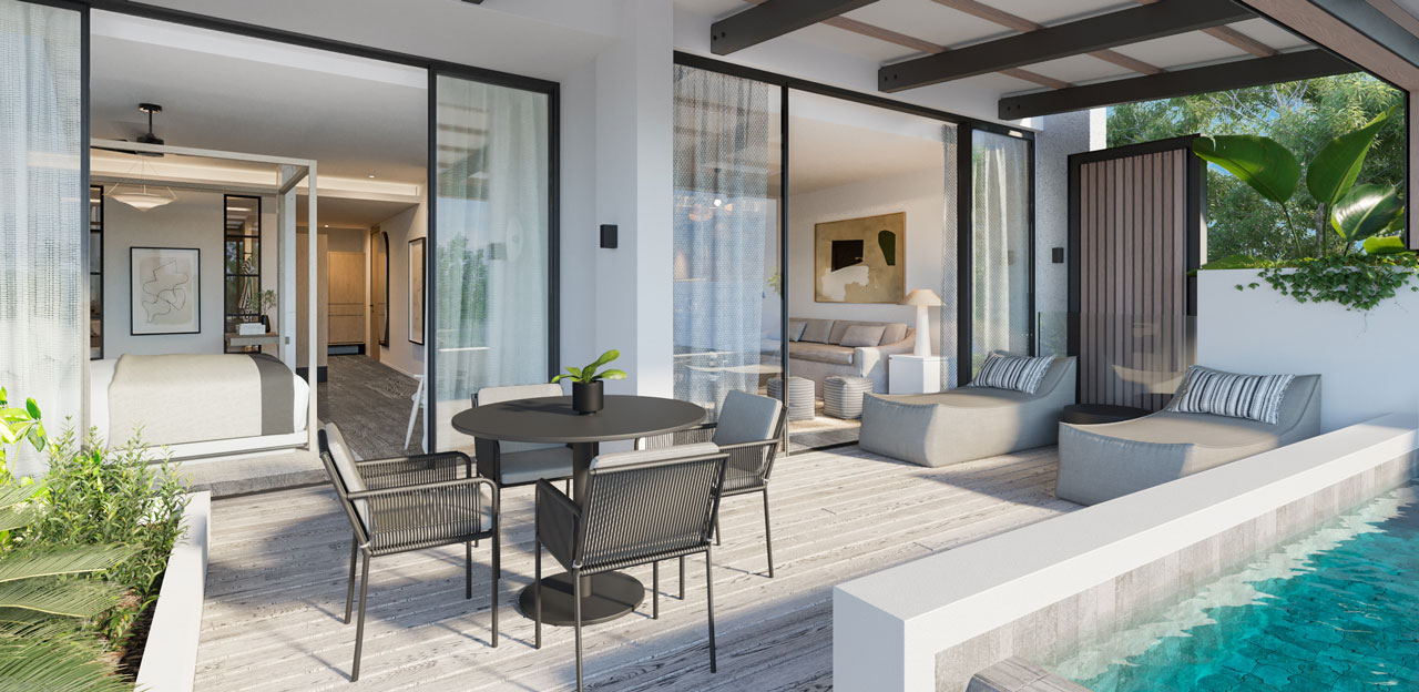 지상, 1층 및 2층에 위치한 65m 2 의 각 스위트룸은 멋진 테라조 타일 욕실,무성한 열대 환경과 아름답게 대조되는 미니멀리즘을 갖추고 있습니다. |