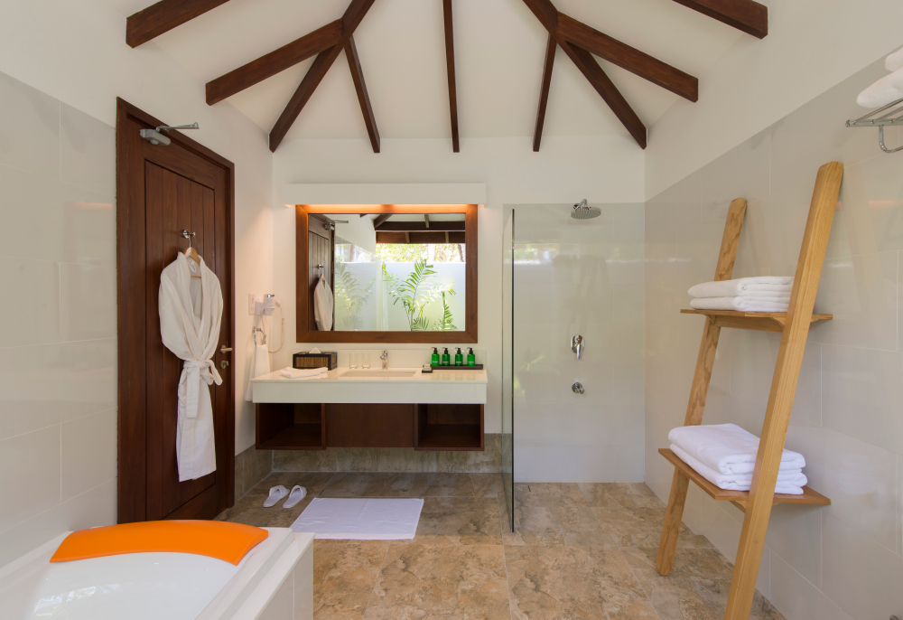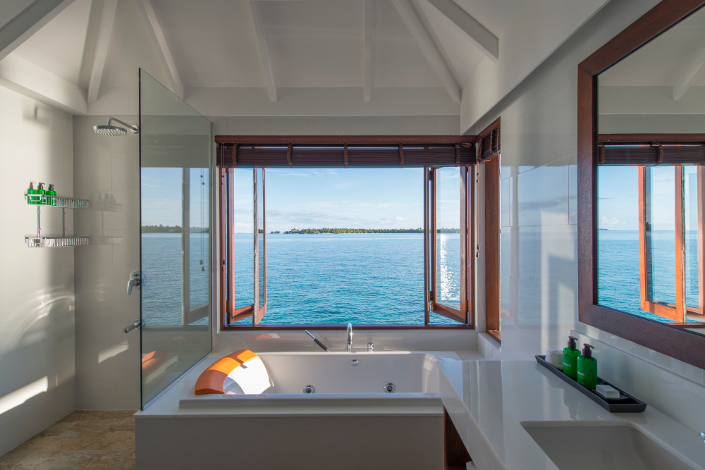 맨발로 완벽한 경험을 할 수 있도록 설계되었으며 바다로 향하는 넓은 베란다와 자쿠지가 구비된 욕조가 있습니다. |
