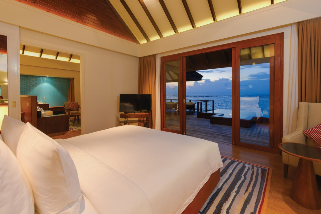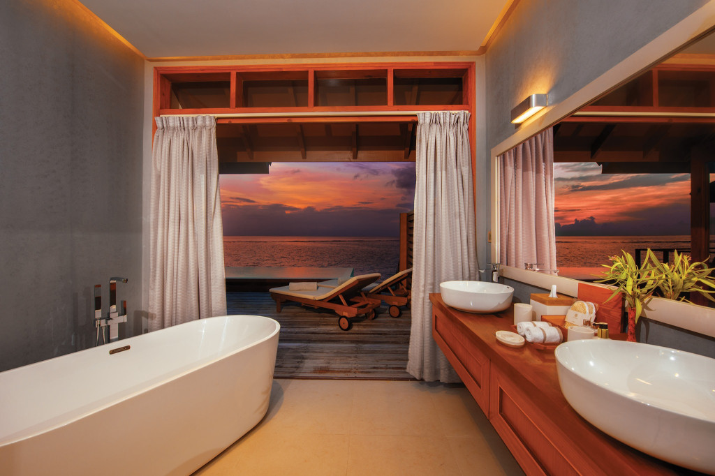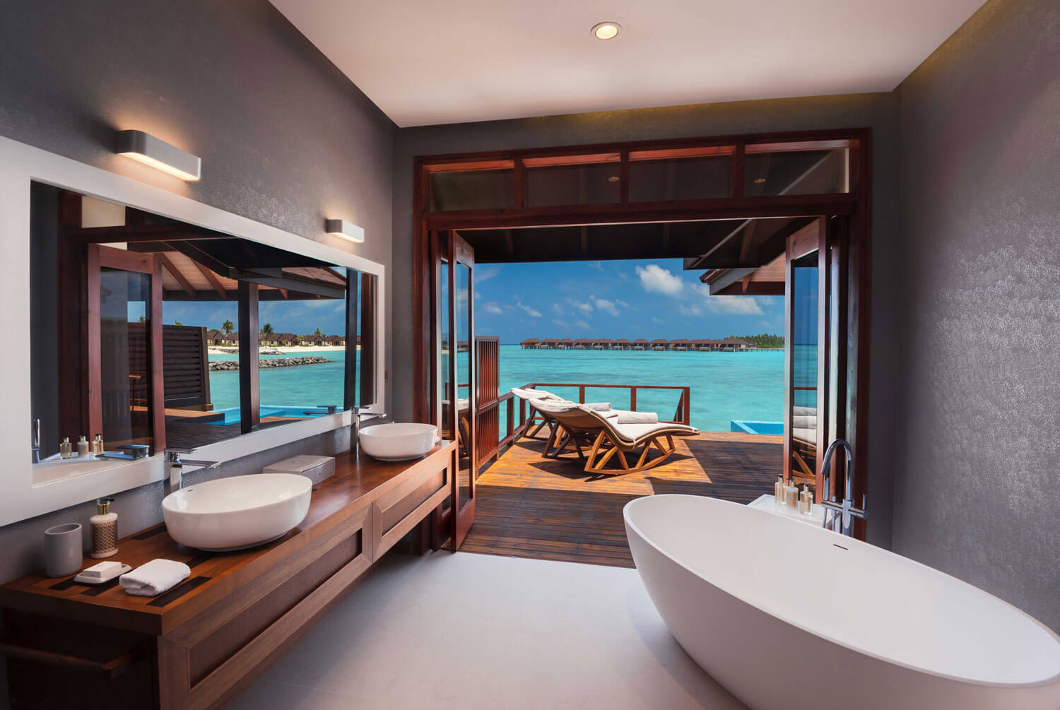몰디브 오버 워터 빌라에서 아름다운 바다 전망을 감상하고 수정처럼 맑은 청록색 라군으로 들어가 수영을 즐겨보세요. 수중 집의 기둥을 감싸는 잔잔한 파도 소리에 감각이 진정되는 동안 편안한 잠에 빠져보세요. 고요한 워터 빌라에서 자연과 가깝게 지내십시오. 아치형 천장과 자연 채광이 들어오는 거대한 유리 미닫이 문이 있습니다. |