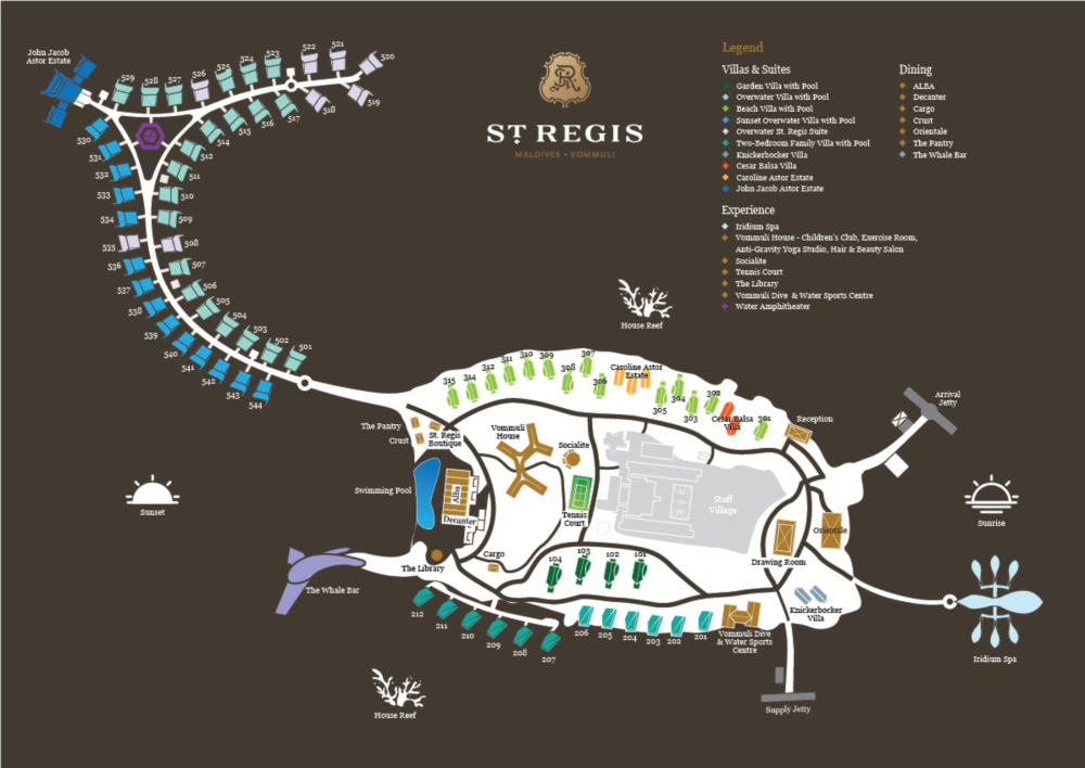 총 77채의 빌라로 Garden Villas With Pool (4 rooms, 150 sq m) / Beach Villas With Pool (14 rooms, 140 sq m) / Overwater And Sunset Overwater Willas With Pool ( 35 rooms, 182 sq m) / Two-Bedroom Family Villas With Pool (12 rooms, 334 sq m) / Two-Bedroom Beach Suites With Pool (2 suites, 531 sq m) / Caroline Astor Estate (1 room, 662 sq m) / John Jacob Astor Estate (1 room, 1,540 sq m) 등의 카테고리로 이루어져 있습니다. |