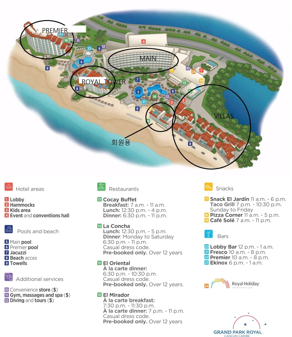 새롭게 리모델링 된 311개의 럭셔리한 객실과 스위트룸을 가진 그랜드 파크 로얄 칸쿤 카리베 호텔 & 리조트는 4개의 레스토랑, 휘트니스 센터를 비롯하여 멋진 시설과 아름다운 카리브해 전망 등을 골고루 겸비하고 있습니다. |